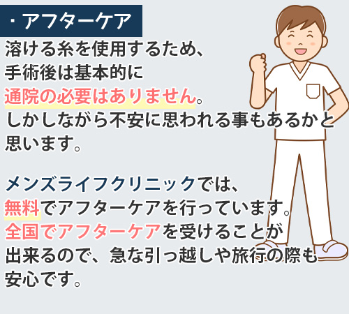 さらに痛みが不安な場合は、静脈麻酔をして眠ったまま手術を受けることもできるので安心です。アフターケア