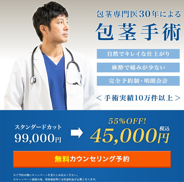 99,000円~ →45,000円~ キャンペーン中55%OFF + 今なら亀頭増大が無料※1 |
